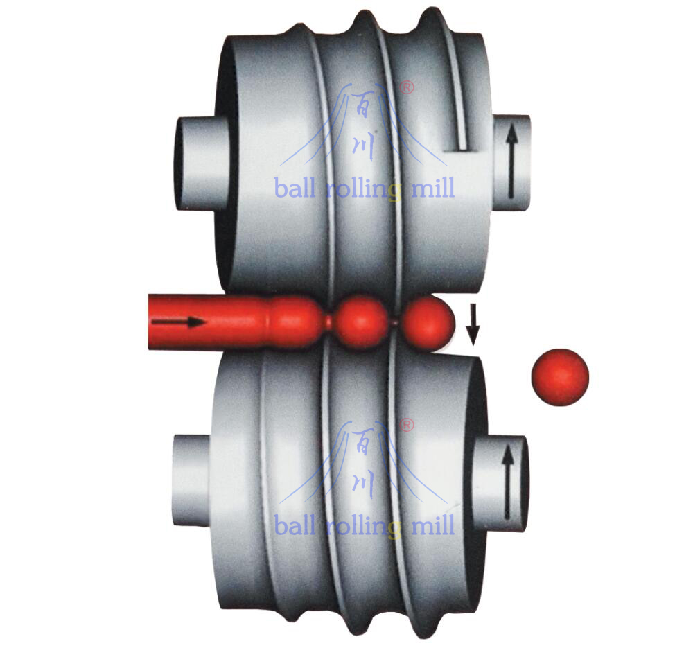 軋輥軸線與軋制線傾斜一定角度。軋輥上有螺旋孔型。軋件螺旋前進。在螺旋孔型作用下,圓鋼逐漸變成球形,球形間連接頸部分越來越細,最后斷開而獲得鋼球。軋后的鋼球經過進一步熱處理后即得到成品鋼球。